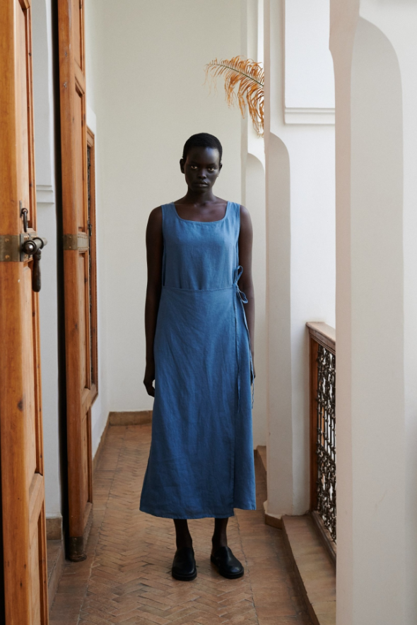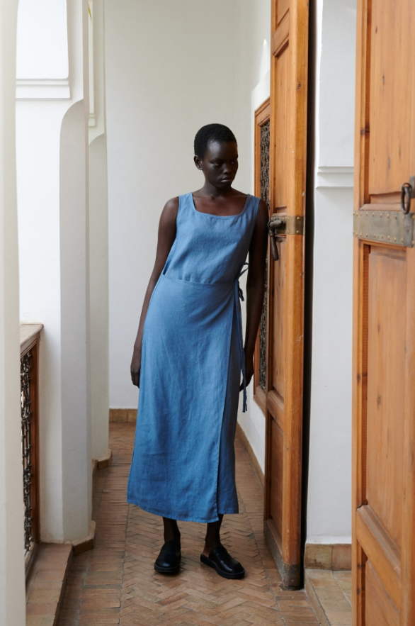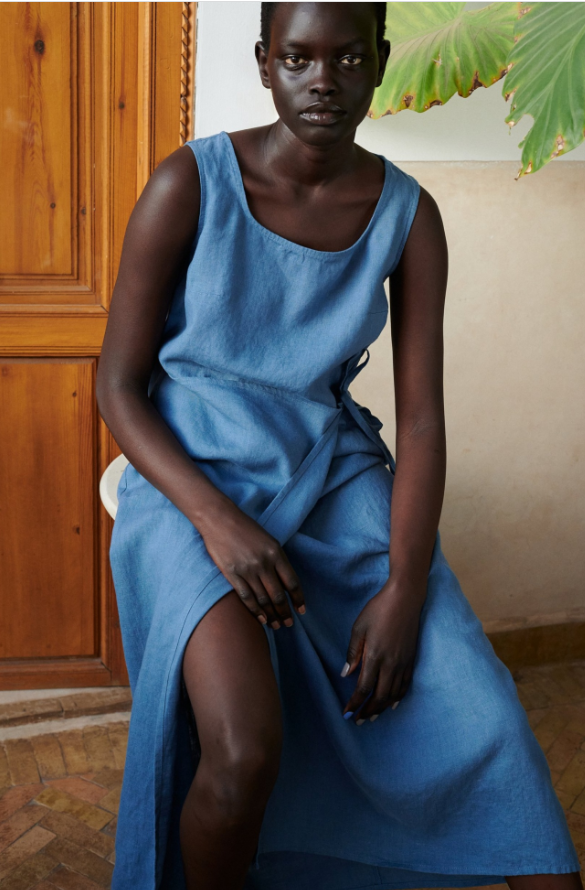 The Alexandra Linen Dress is a testament to timeless design and understated charm. The sleeveless, square – necked bodice offers a classic look that highlights the shoulders and collarbone, giving a touch of elegance. The real charm lies in the side – tie detail. These ties, when cinched, not only create a more defined waistline, accentuating your curves, but also add a playful, adjustable element to the dress. They can be tied in a neat bow for a more polished appearance or left slightly loose for a relaxed, bohemian feel.The dress features a gently flared midi – length skirt that skims over the legs, providing a flattering silhouette for different body types. The fabric drapes gracefully, moving with you as you walk, adding a sense of fluidity to your movement. In a soothing blue hue, the dress exudes a calm and composed aura. Whether you’re attending a garden party, visiting an art gallery, or just running errands, the Alexandra Linen Dress ensures you look effortlessly stylish. Its combination of classic elements like the square neck and sleeveless design, along with the unique side – tie detail, makes it a standout piece that balances simplicity and sophistication.