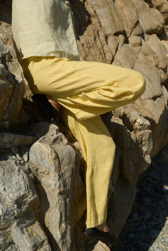 The Barrel Pants – Clarie are a testament to thoughtful design and timeless style. The barrel – shaped cut is masterfully crafted, gently widening from the waist down to create a flattering, flowing silhouette that drapes elegantly over the legs. This unique shape not only offers freedom of movement but also flatters various body types, giving the wearer a sense of poise and grace.Every detail of these pants is carefully considered. The waistband is designed for a comfortable fit, ensuring that the pants stay in place without feeling restrictive. The neatly stitched pockets are both functional and stylish, providing a convenient place to store small essentials while maintaining the clean lines of the pants. The warm yellow fabric has a lovely texture, soft to the touch and breathable, making it perfect for hot days.Whether paired with the matching checkered sleeveless top for a coordinated look or with contrasting pieces to create a bold statement, the Barrel Pants – Clarie combine delicate details with a relaxed fit. They bring a touch of understated sophistication to any outfit, making them a cherished piece for those who appreciate refined yet comfortable fashion.