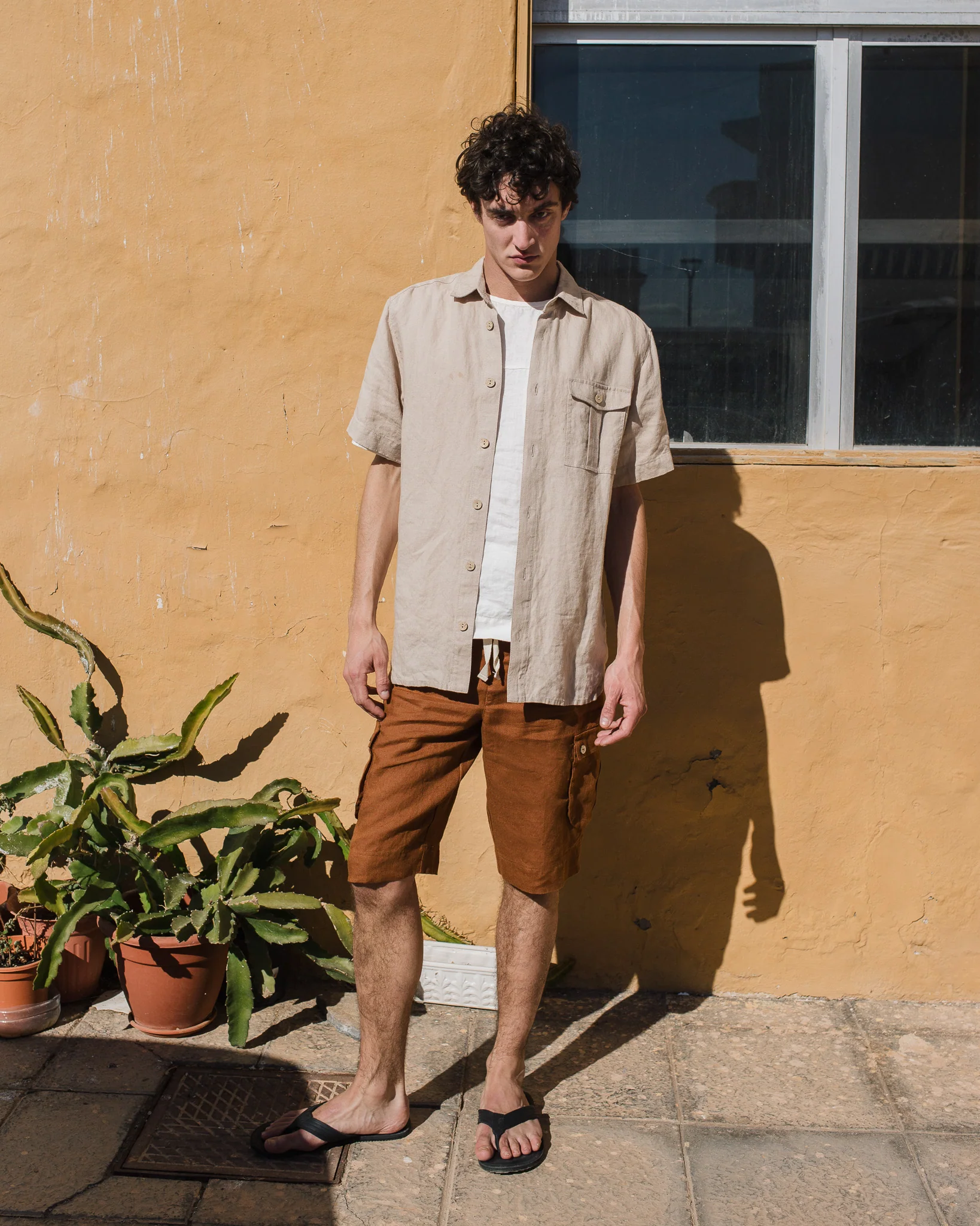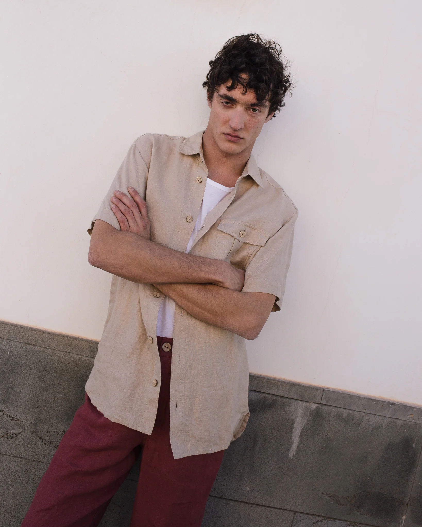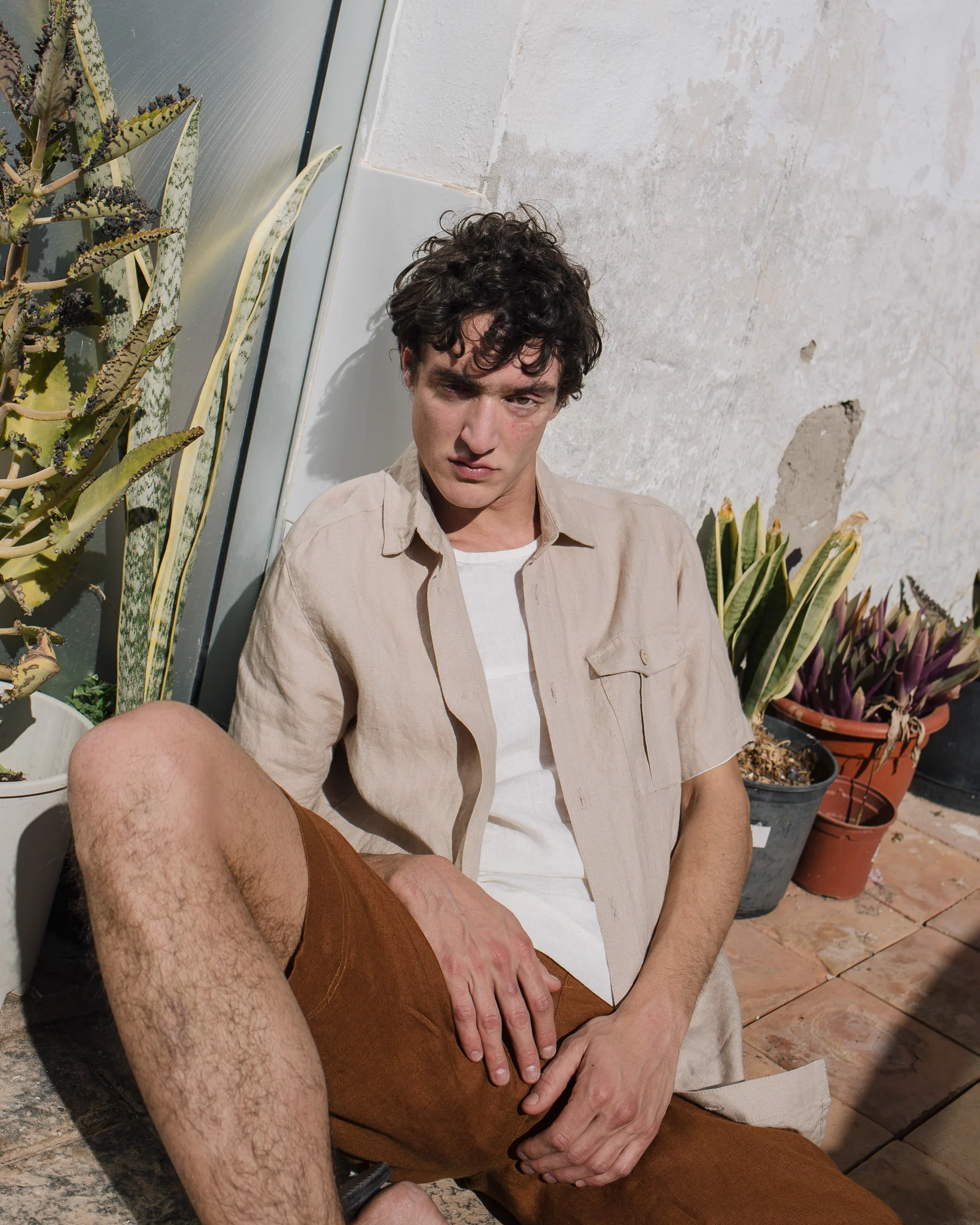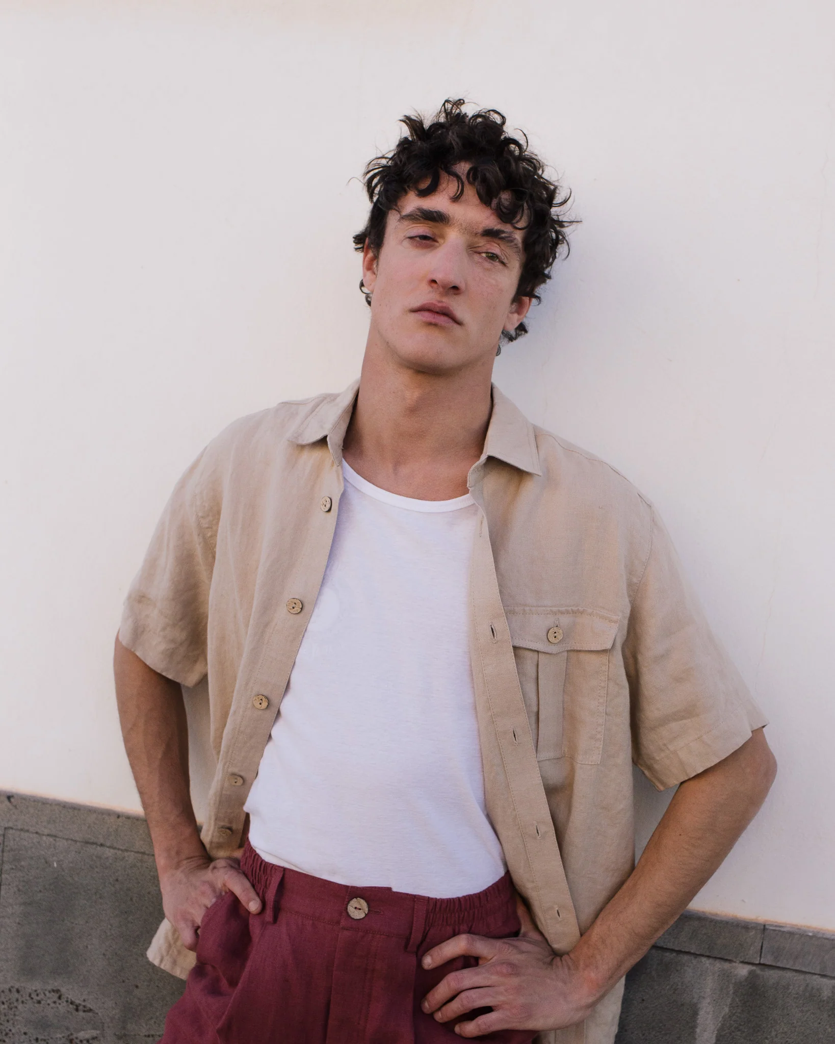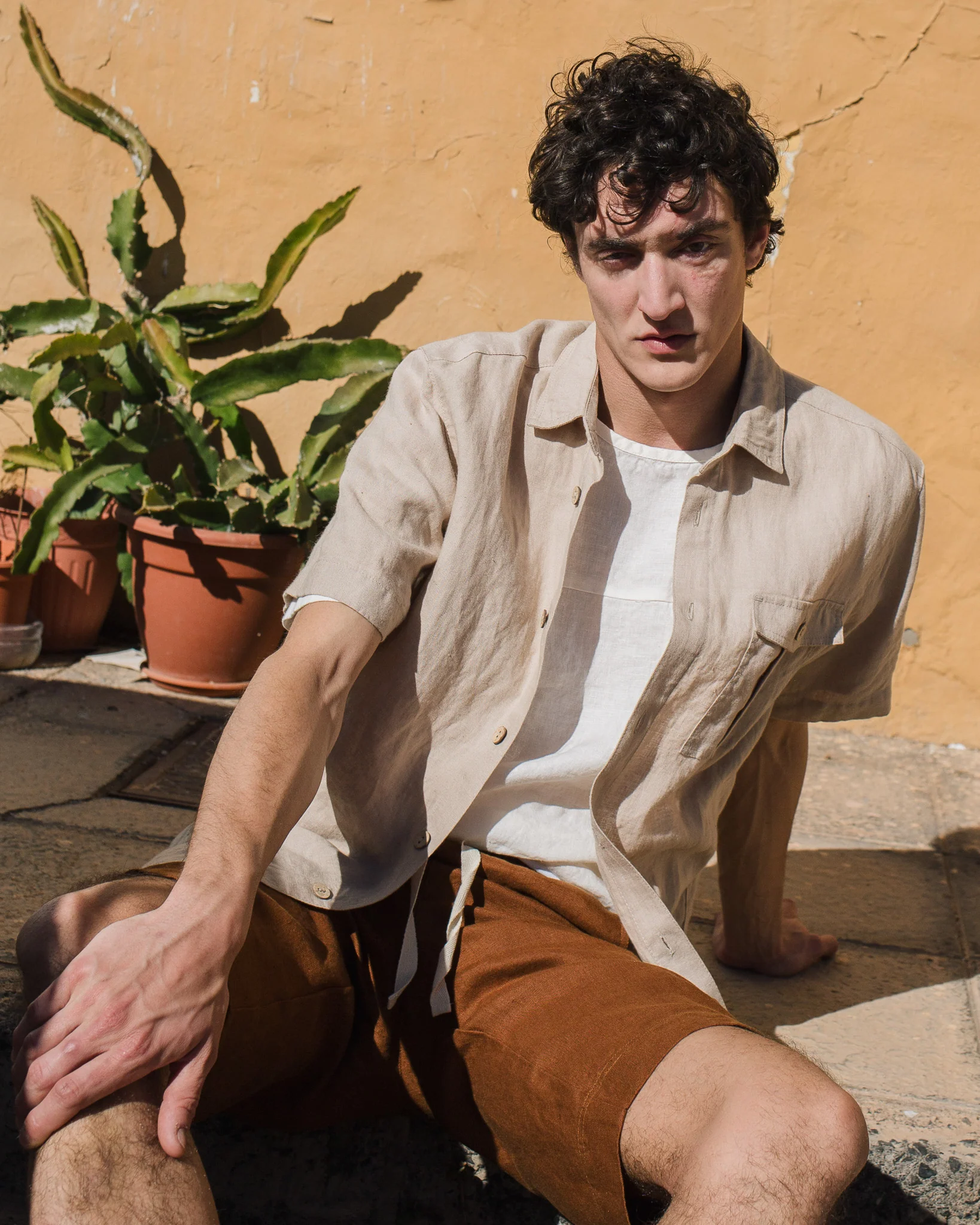 The beige linen short – sleeve shirt is a masterful piece that seamlessly blends laid – back charm with understated sophistication. Its silhouette is deliberately relaxed, offering a sense of ease without appearing slouchy. The linen fabric, with its natural texture and inherent breathability, not only keeps you comfortable in hot temperatures but also adds a touch of organic luxury. The pointed collar sits neatly around the neck, creating a sleek and approachable line, while the full button – down front allows for versatile styling — wear it fully fastened for a polished look or leave it open over a tee for a more casual feel.Small details enhance its allure: the precise stitching along the seams ensures durability and a refined finish, and the chest pocket is both functional and a stylish accent. The soft beige hue is incredibly versatile, evoking a sense of warmth and tranquility, and it pairs effortlessly with a wide range of bottoms, from light – wash denim shorts and chinos to neutral – toned trousers or even linen pants for a coordinated summer ensemble.When it comes to styling, this shirt opens up numerous possibilities. For a casual daytime look, pair it with white linen shorts and canvas sneakers — the beige shirt adds a touch of warmth and sophistication to the relaxed outfit. For a smart – casual office setting, tuck it into tailored chinos and finish with leather loafers for a polished yet approachable vibe. On beach vacations, wear it unbuttoned over a white tank top and swim trunks, adding flip – flops for an effortlessly chic resort look. No matter how you choose to wear it, this shirt’s comfortable fabric, versatile design, and charming details make it a must – have in any summer wardrobe, capable of elevating even the simplest outfits to new heights of style.