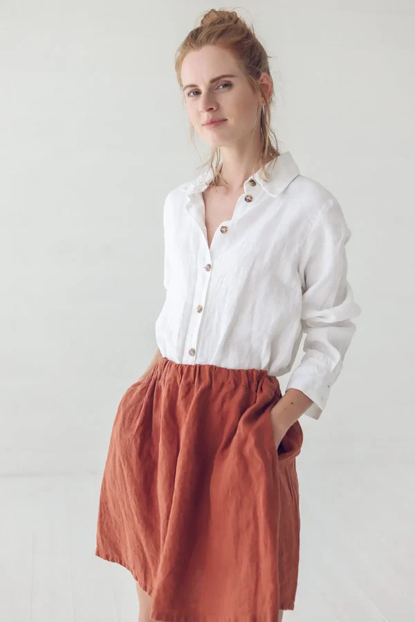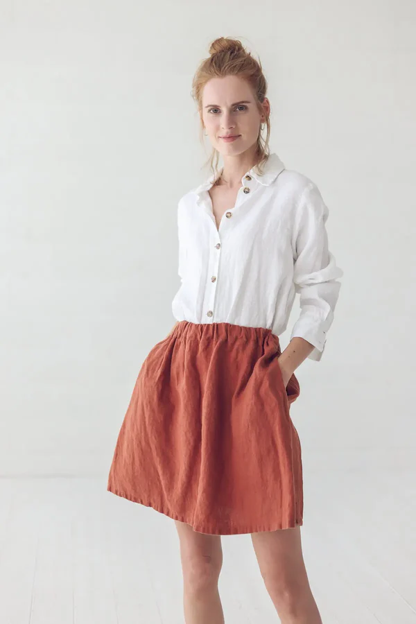 The casual linen skirt from Epic Linen is a testament to meticulous design and timeless allure. The silhouette is thoughtfully crafted, with a slightly flared shape that starts from the elastic waistband, creating a gentle A – line that flatters various body types. This design not only allows for ease of movement but also gives the skirt a graceful drape as you walk.Every small detail contributes to its charm. The fabric, though linen, has a remarkably soft touch and a beautiful texture that adds depth to the skirt’s appearance. The terracotta color, rich and warm, is carefully chosen to complement a wide range of skin tones and other clothing items. The elastic waistband is hidden discreetly, maintaining a clean and streamlined look while providing the convenience of an adjustable fit.Whether styled with a simple tank top for a bohemian – inspired look or paired with a tailored blazer for a more polished ensemble, this skirt adapts effortlessly. It embodies a sense of understated luxury, where comfort meets refined style. For those who seek clothing that feels as good as it looks, this casual linen skirt is a true gem, elevating everyday outfits with its subtle yet captivating presence.
