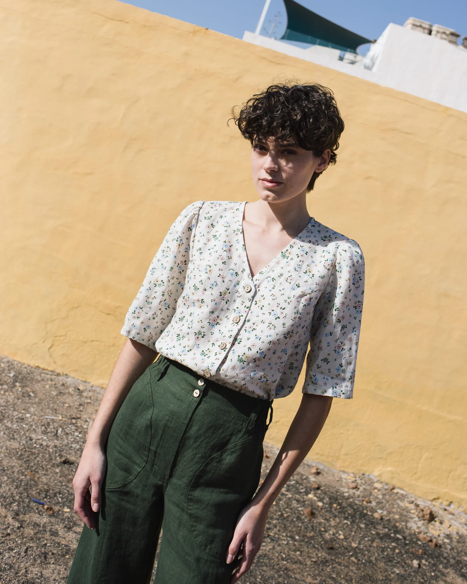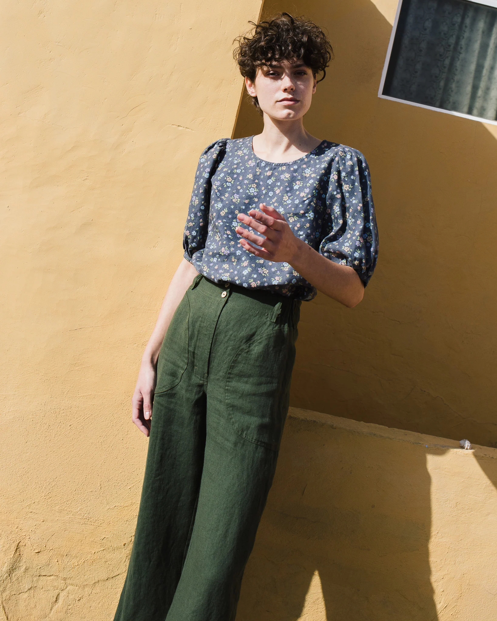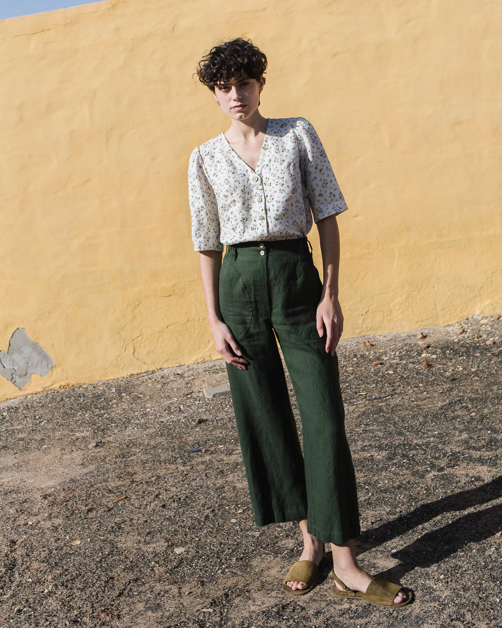 The dark green linen high – waist wide – leg trousers are a charming creation that seamlessly combines casual comfort with understated vintage sophistication. Their high – waist wide – leg fit is designed to offer a sense of elegance while still maintaining a comfortable feel. The linen fabric, with its inherent breathability and soft handfeel, not only keeps you cool in mild temperatures but also adds a touch of natural texture and warmth. The button closure at the front is a standout feature, providing a secure fit and a polished, retro – inspired aesthetic.Small details enhance their allure: the neatly finished hems, the subtle texture of the linen fabric, and the practical side pockets all contribute to a refined and functional appearance. The dark green hue is rich and versatile, pairing effortlessly with a wide range of tops. For a laid – back weekend look, pair them with a dainty floral linen blouse (like the one in the picture), a denim jacket, and sandals. To elevate the style for a casual brunch, opt for a white linen shirt, a woven belt, and espadrilles.When it comes to layering, these trousers work well too. On cooler days, pair them with a lightweight knit cardigan or a denim vest, and the high – waist design ensures they still fit comfortably and look stylish. No matter how you choose to wear them, these trousers’ comfortable fabric, versatile design, and charming details make them an essential addition to any casual wardrobe, capable of transforming simple outfits into effortlessly stylish ensembles that are perfect for both everyday wear and casual outings, especially in sunny and vibrant environments.
