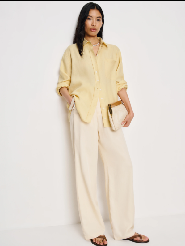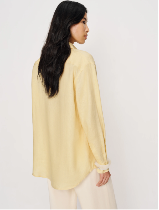 The Eli Oversized Linen Shirt is a masterclass in balancing relaxed fit with refined details. The oversized cut is the heart of its design — it drapes loosely over the body, creating a sense of effortless ease that’s ideal for those who favor comfort without sacrificing style. This roomy silhouette allows for free movement and a laid – back aesthetic, yet it never feels shapeless, thanks to subtle tailoring that gives it a gentle structure.The classic pointed collar is a timeless touch, elevating the shirt from purely casual to something that can easily fit into more polished looks. The front button placket is clean and streamlined, with smooth, evenly spaced buttons that add a touch of understated elegance. The chest pocket is not just a functional addition but also a design element, its placement and shape carefully considered to complement the shirt’s overall proportions.The full – length sleeves are another highlight, with enough room to be rolled up multiple times, creating subtle cuffs that add texture and visual interest. In a soft, buttery yellow, the shirt has a luminous quality that brightens up any ensemble. Whether you’re pairing it with crisp white trousers for a sophisticated daytime look or throwing it over a slip dress for a breezy evening outfit, the Eli Oversized Linen Shirt marries comfort, style, and thoughtful design, making it a standout piece for those who appreciate the beauty of understated luxury.