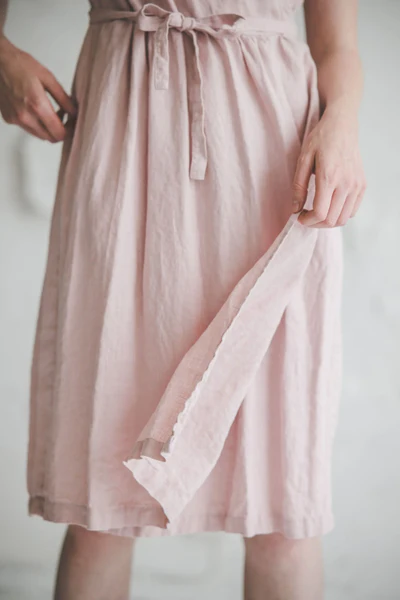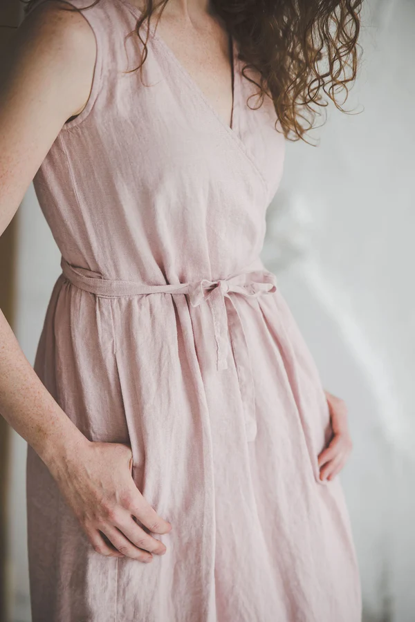 The blush pink wrap dress from Epic Linen is a masterclass in crafting a garment that marries delicate details with a flattering silhouette. The wrap construction is the heart of its design, creating a V – neckline that elongates the neck and draws attention to the collarbone with elegant subtlety. This design also allows the dress to drape softly over the torso, skimming curves without feeling restrictive.At the waist, the self – tie belt is both functional and decorative. It can be tied into a neat bow or a loose knot, giving you the power to accentuate your waist or let the dress flow more freely. The fabric falls into a gentle A – line skirt that reaches the mid – calf, offering a graceful sweep with every step. Subtle stitching along the wrap edges and the belt loops speaks to the meticulous craftsmanship, ensuring the dress holds its shape while maintaining a light, airy feel. Every element, from the soft blush hue that complements a range of skin tones to the thoughtful placement of the belt, works in harmony to create a piece that feels both timeless and utterly of the moment — ideal for everything from a brunch date to a garden party, where you want to feel effortlessly polished and beautifully at ease.