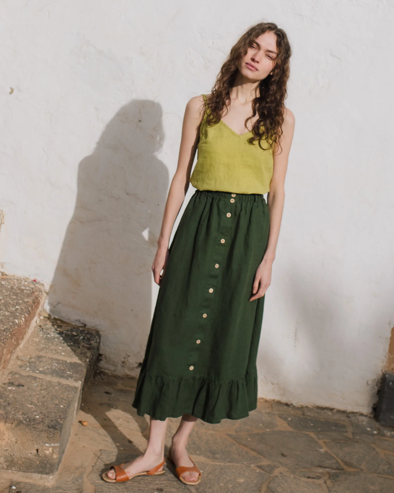 features and Special design:The EUREKA ruffled hem buttoned linen skirt is a charming blend of whimsy and refinement. Its cascading ruffled hem and neat row of buttons infuse any ensemble with a touch of delicate allure.