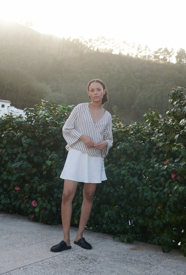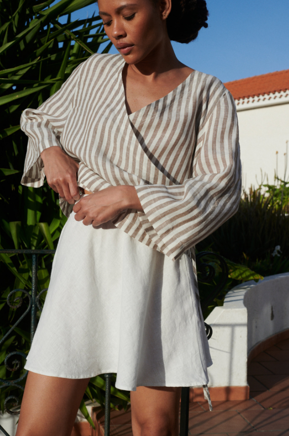 The Georgia Linen Top is a testament to thoughtful design and timeless appeal. The striped pattern, in soft neutral tones, creates a visual harmony that’s both classic and inviting. The V – neckline is crafted to sit gracefully, framing the collarbone and shoulders in a way that feels effortlessly alluring without being overly revealing.The loose, flowy fit is a standout feature, draping beautifully over the body to ensure comfort while maintaining a polished appearance. This silhouette flatters various body types, skimming over the figure without clinging, allowing for ease of movement. The long sleeves, with their gentle flare at the cuffs, add a delicate, romantic touch. Each cuff is meticulously formed, lending texture and a sense of whimsy to the overall silhouette.Subtle elements, like the clean seams and the smooth hemline, speak to the garment’s quality craftsmanship. Whether paired with wide – legged linen pants for a cohesive, bohemian look or tucked into a high – waisted skirt for a more structured ensemble, the Georgia Linen Top marries classic aesthetics with modern comfort, making it a cherished piece for those who appreciate understated sophistication.