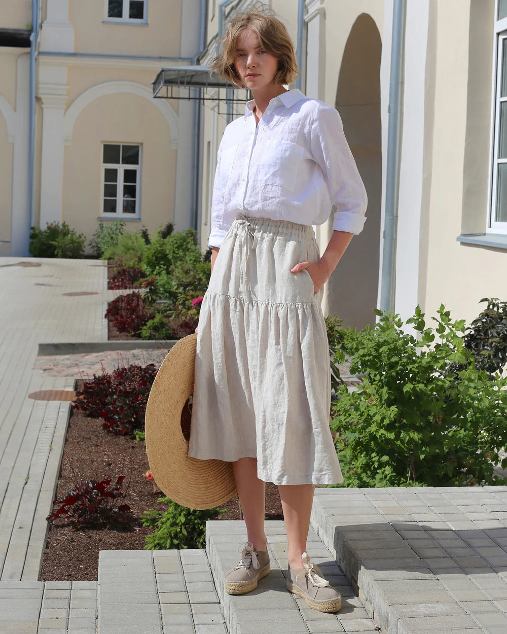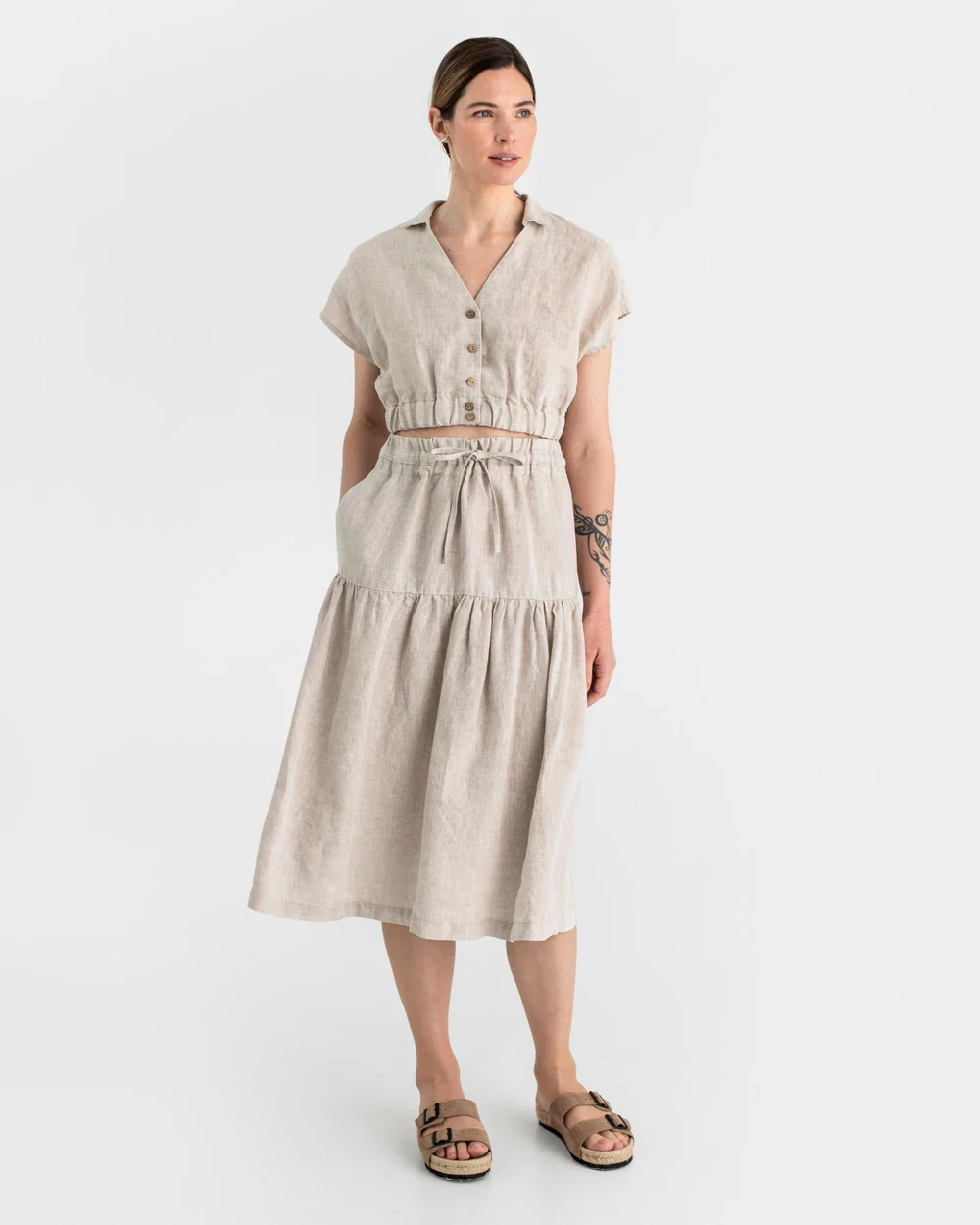 The pairing of the HAVASU top in natural melange and the UBUD skirt in natural melange is a masterclass in creating a cohesive and elegant ensemble through thoughtful design. The HAVASU top boasts a beautifully tailored cropped silhouette, with a collared neckline and a row of buttons down the front that add a touch of structure and sophistication. The way it cinches gently at the waist enhances the figure while maintaining a relaxed fit, perfect for warm days.As for the UBUD skirt, its design is equally impressive. The drawstring waist allows for a customizable fit, ensuring comfort without sacrificing style. The tiered layers of the skirt create a lovely, flowing movement, with each tier carefully crafted to fall gracefully and add volume in a subtle, flattering way. The natural melange fabric, with its soft texture and muted tones, unites the two pieces seamlessly, giving the outfit a cohesive and refined look.Every small detail, from the precise stitching on the top’s buttons to the neatly finished seams of the skirt’s tiers, speaks to the quality of the pieces. Together, they form an outfit that’s versatile enough for various occasions, transitioning effortlessly from a day at the beach to an evening dinner, all while radiating a sense of effortless grace.