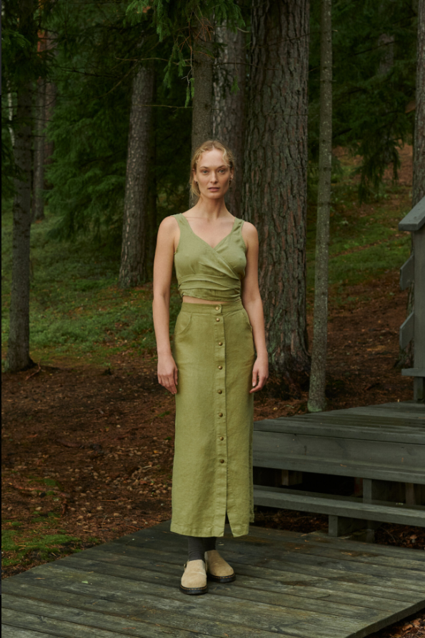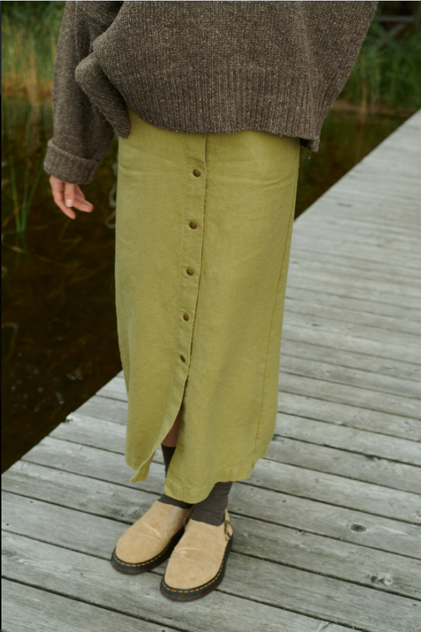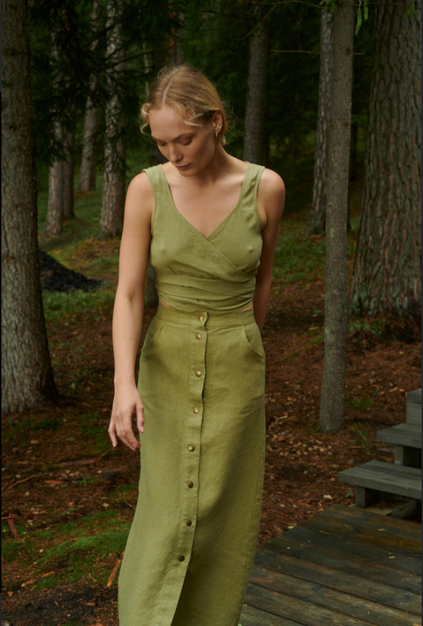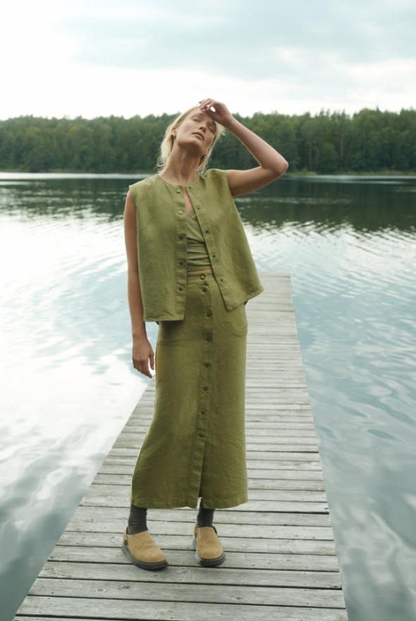 The Heidi Heavy Linen Button – Front Midi Skirt is a testament to the beauty of well – crafted design and quality materials. Woven from dense, heavy – weight linen, the skirt has a substantial feel that drapes gracefully, molding to the body’s curves without clinging. The earthy green hue of the linen evokes the tranquility of a forest, adding a natural and calming element to the piece.The front – button placket is the centerpiece of this skirt. A row of carefully placed buttons runs from the waist to the hem, creating a vertical line that elongates the silhouette. These buttons are not only functional, allowing for easy wear and removal, but also serve as a striking design feature, harking back to classic workwear styles while remaining distinctly modern.Adding to its allure are the practical pockets. Nestled on either side, they blend seamlessly with the skirt’s structure, providing a convenient place to store small essentials. Their presence doesn’t disrupt the skirt’s sleek lines but rather enhances its overall appeal, marrying fashion with functionality. Whether you’re strolling through a park, running errands in the city, or enjoying a weekend getaway, the Heidi Heavy Linen Button – Front Midi Skirt offers a perfect balance of style, comfort, and practicality.