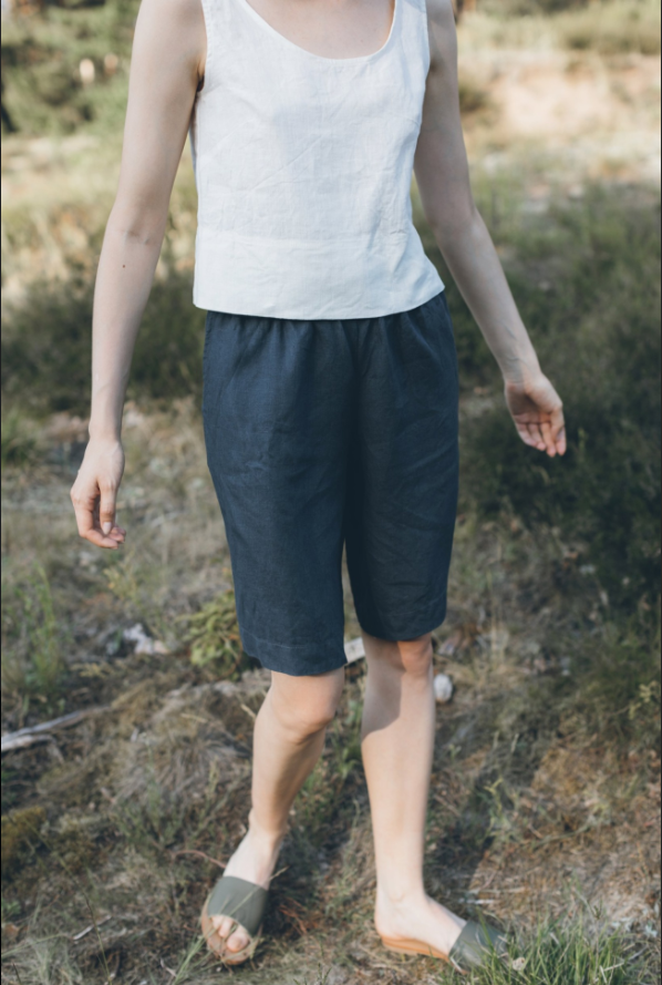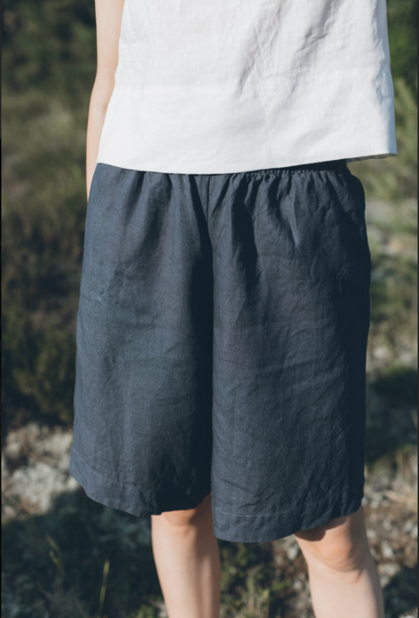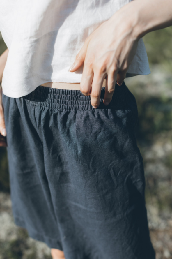 The Hike Linen Shorts are a testament to thoughtful design and outdoor elegance. The elastic waistband is meticulously crafted, gently hugging the waist without feeling restrictive, providing a snug yet comfortable fit that adapts to your body’s shape during movement. The relaxed fit drapes gracefully over the hips and thighs, creating a flattering silhouette that allows for easy strides and unrestricted motion, essential for any outdoor activity.Every detail, from the neatly stitched hems that ensure durability to the subtly integrated pockets that maintain a clean look, showcases the garment’s high – quality craftsmanship. The pockets are not only functional for storing small items but also seamlessly blend into the design, without disrupting the short’s streamlined appearance.The deep, understated color exudes a sense of calm and sophistication, making it versatile for both outdoor expeditions and casual urban outings. Made from linen, the shorts have a breathable and lightweight texture, perfect for keeping cool on sunny days. Whether paired with a rugged outdoor shirt for a hiking trip or with a chic blouse for a relaxed city look, the Hike Linen Shorts marry delicate details with practical comfort, making them a cherished piece for those who love to explore in style.