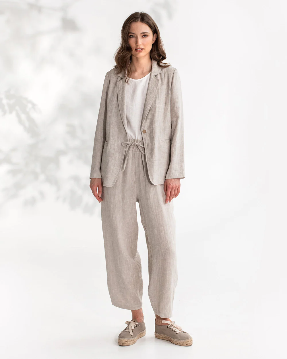 The light beige linen blazer is a masterstroke in combining laid – back ease with understated luxury. Its silhouette is intentionally relaxed, offering a sense of comfort while still maintaining a refined look. The linen fabric, with its natural texture and inherent breathability, not only keeps you cool on sunny days but also imparts a touch of organic elegance. The single – breasted front, adorned with a warm wooden button, is a charming detail that enhances the blazer’s classic appeal, and the notch lapels frame the neck gracefully.Small details elevate its allure: the precise stitching along the edges ensures durability and a polished finish, and the subtle darts at the waist create a flattering shape without being too restrictive. The light beige color is incredibly versatile, evoking a sense of calm and timelessness, and it pairs seamlessly with a wide range of colors, from crisp whites and deep navys to soft pastels or bold patterns for a more playful ensemble.When it comes to styling, this blazer opens up a world of possibilities. For a casual daytime outing, pair it with a white tee, high – waisted denim shorts, and sandals — the linen jacket adds a touch of sophistication to the relaxed ensemble. For a more polished look, wear it over a silk blouse and tailored pants, finishing with heels for a chic office – appropriate outfit. On cooler evenings, layer it over a lightweight knit sweater and a midi skirt, adding a scarf for extra warmth and a pop of color. No matter how you choose to style it, this blazer’s comfortable fabric, versatile design, and charming details make it a must – have in any wardrobe, capable of elevating even the simplest outfits to new heights of style.