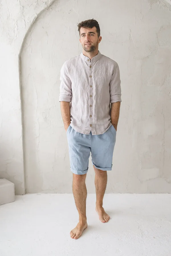 The light blue linen shorts are a masterful creation that seamlessly merges casual charm with contemporary sophistication. Their silhouette is intentionally relaxed, offering a sense of ease without appearing sloppy. The linen fabric, with its natural texture and inherent breathability, not only keeps you cool on sunny days but also imparts a touch of laid – back luxury. The drawstring waist is a key element — it allows for a customized fit, ensuring comfort throughout the day, while the cuffed hems add a subtle, refined touch that elevates the overall look.Small details enhance their allure: the precise stitching along the seams ensures durability and a neat finish, and the side pockets are both functional and stylish. The soft light blue color is incredibly versatile, evoking a sense of freshness and tranquility, and it pairs effortlessly with a wide range of tops, from crisp white linen shirts and casual tees to preppy polos or even lightweight sweaters for cooler summer evenings.When it comes to styling, these shorts open up a world of possibilities. For a casual daytime look, pair them with a simple white tee and canvas sneakers — the light blue shorts add a pop of color to the relaxed outfit. For a smarter casual setting, tuck a linen shirt into them and finish with leather sandals for a polished yet approachable vibe. On beach vacations, wear them with a striped polo and espadrilles for an effortlessly chic resort look. No matter how you choose to style them, these shorts’ comfortable fabric, versatile design, and charming details make them a must – have in any summer wardrobe, capable of elevating even the simplest pieces into a stylish statement.