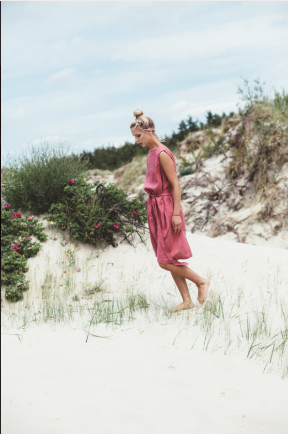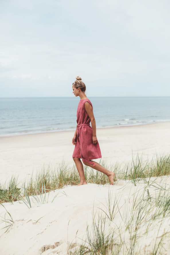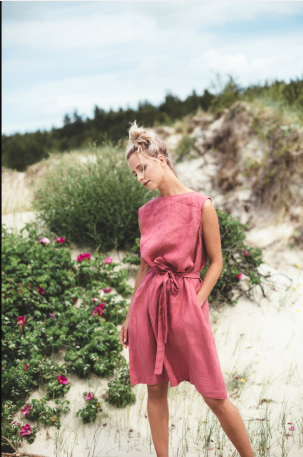 The Nida Sleeveless Linen Dress with Belt is a testament to thoughtful design and timeless appeal. Woven from premium linen, the fabric boasts a soft, airy texture that drapes beautifully, moving gracefully with every step. The sleeveless silhouette is the epitome of warm – weather ease — it showcases the shoulders and arms while allowing for unrestricted movement.A standout detail is the self – tie belt, a slender accessory that transforms the dress from a relaxed shape to a more tailored, feminine form. It can be tied in a neat bow or left to dangle casually, each style adding a unique touch. The belt not only enhances the dress’s shape but also offers versatility, as it can be adjusted to suit different body types and preferences.The boat – neckline is another charming element, framing the collarbone and neck in a delicate, elegant manner. The knee – length skirt skims the legs, balancing casualness with sophistication. In a lovely rose hue, the dress evokes the warmth of summer days, making it a perfect choice for outdoor adventures or leisurely afternoons. Whether you’re strolling through a coastal town, attending a garden party, or simply enjoying a quiet moment in the sun, the Nida Sleeveless Linen Dress with Belt encapsulates a sense of effortless charm, ensuring you feel both comfortable and beautifully put – together.