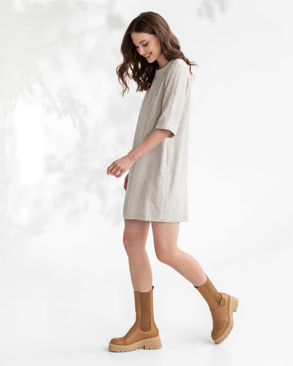 features and Special design:This oatmeal – colored dress is a beautiful embodiment of minimalist elegance. The boat neckline and relaxed shift silhouette create a refined, effortless look.
