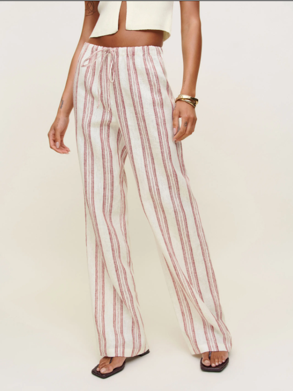 The Olina Linen Pant is a testament to thoughtful design and timeless appeal. The striped pattern, in gentle hues, creates a visual harmony that’s both classic and inviting. The wide – leg cut is crafted to perfection, draping gracefully over the legs and elongating the silhouette, making one look taller and slimmer.The drawstring waist is not only functional but also adds a touch of casual charm. It can be adjusted to your liking, offering a snug or relaxed fit as desired. This detail not only ensures comfort but also allows for easy styling, whether you want to tuck in a top for a polished look or leave it untucked for a laid – back vibe.Subtle elements, like the clean seams and the smooth hemline, speak to the garment’s quality craftsmanship. The linen fabric lends a breathable and lightweight feel, perfect for warm days, while the striped pattern adds a playful yet sophisticated touch. Whether paired with a fitted tank top for a chic summer look or with a button – down shirt for a more refined outfit, the Olina Linen Pant marries classic aesthetics with modern comfort, making it a cherished piece for those who appreciate understated sophistication.