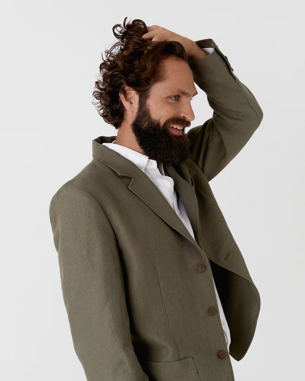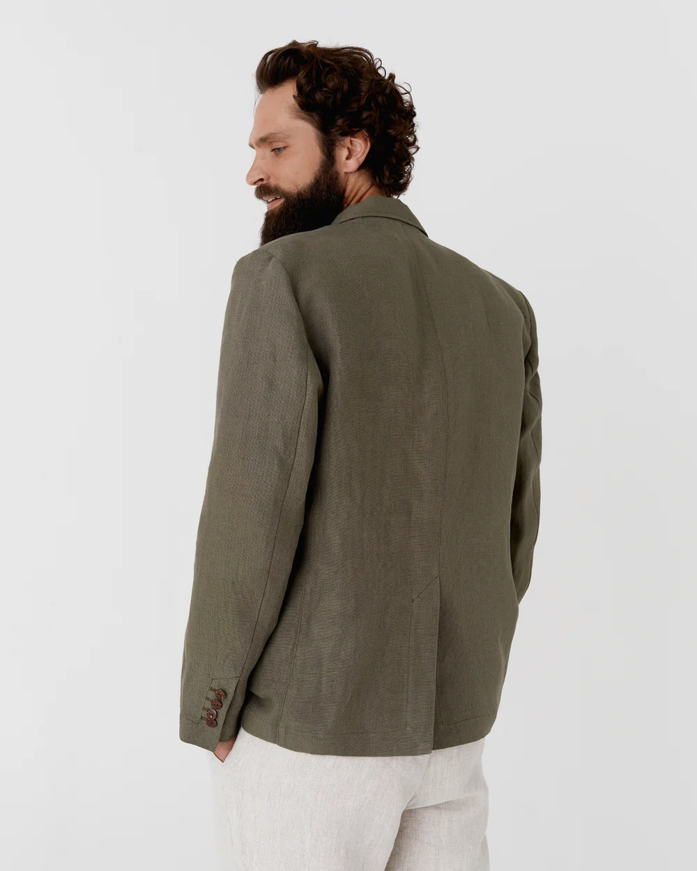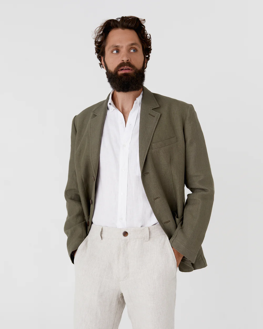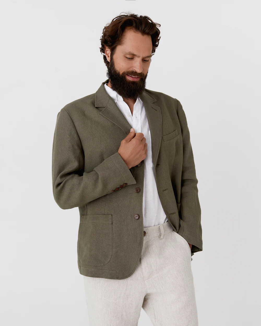 The olive green linen blazer is a masterful creation that seamlessly blends classic tailoring with modern comfort. Its silhouette is slim – fitting, designed to flatter the figure while allowing for natural movement. The linen fabric, with its inherent breathability and soft texture, not only keeps you cool in mild temperatures but also adds a touch of relaxed sophistication. The notched lapel frames the face elegantly, while the three – button closure can be worn fastened for a formal look or undone for a more laid – back vibe.Small details enhance its allure: the precise stitching along the seams ensures durability and a neat finish, and the subtle sheen of the linen fabric catches the light beautifully. The rich olive green color is incredibly versatile, evoking a sense of connection to nature and refinement, and it pairs effortlessly with a wide range of shirts and trousers. For a formal occasion, pair it with a crisp white dress shirt, a silk tie, and tailored dark trousers. For a casual event, opt for a light blue linen shirt, leave the blazer unbuttoned, and finish with chinos and suede loafers.When it comes to styling, this blazer opens up numerous possibilities. Layer a lightweight knit sweater underneath for cooler days, or wear it separately with jeans and a t – shirt for a smart – casual look. It can also be paired with shorts and sandals for a breezy summer ensemble. No matter how you choose to wear it, this blazer’s comfortable fabric, versatile design, and charming details make it an essential piece in any wardrobe, capable of elevating even the simplest outfits to new levels of style.