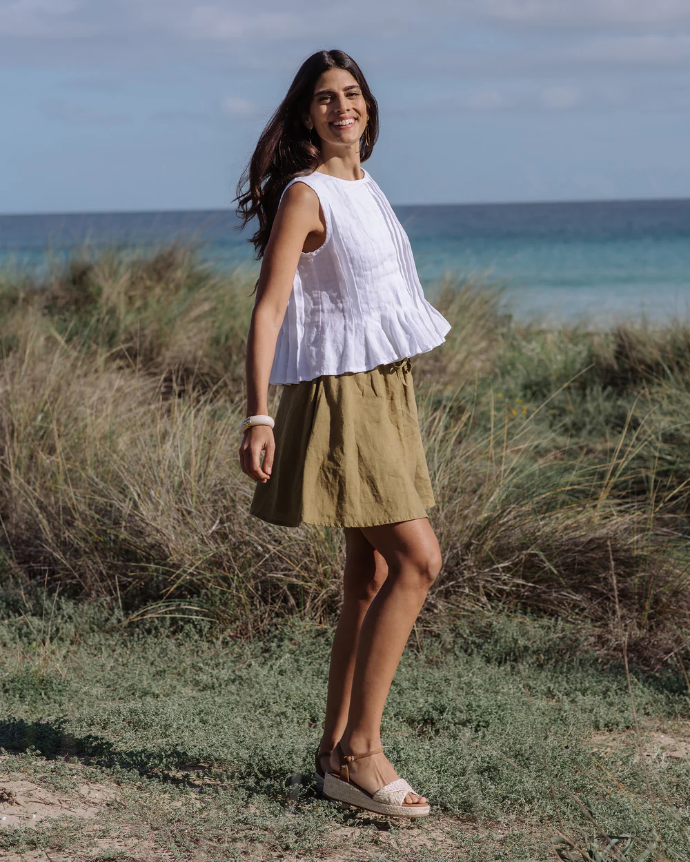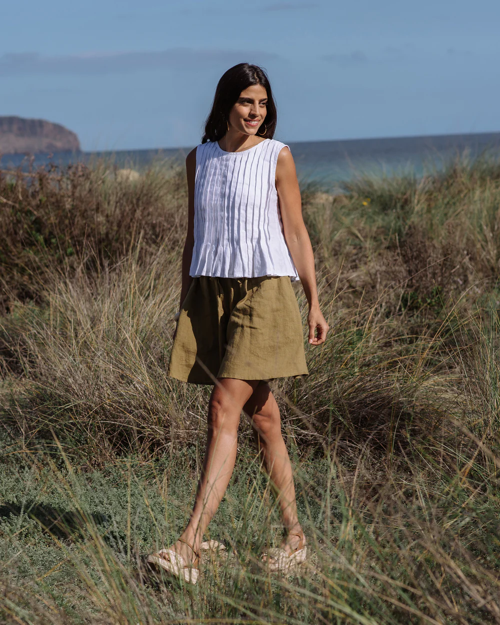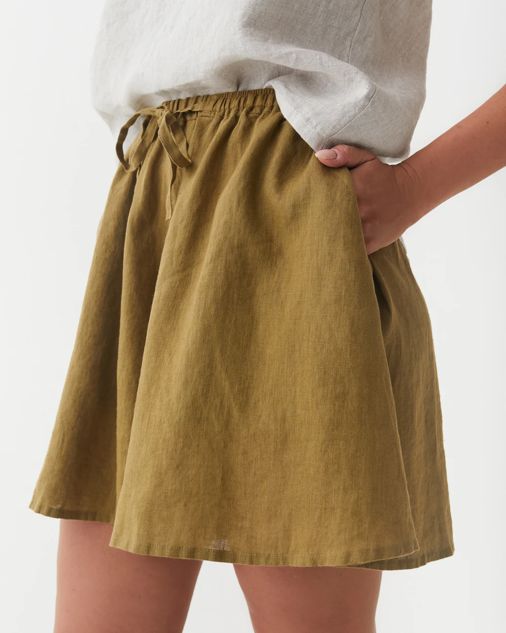 The olive green linen drawstring shorts are a charming creation that seamlessly combines casual comfort with understated appeal. Their relaxed fit is designed to offer a sense of ease while still maintaining a flattering shape. The linen fabric, with its inherent breathability and soft handfeel, not only keeps you cool in mild temperatures but also adds a touch of natural texture and warmth. The drawstring waistband is a standout feature, providing adjustability for a perfect fit and a casual, laid – back aesthetic.Small details enhance their allure: the neatly finished hems, the subtle texture of the linen fabric, and the practical side pockets all contribute to a polished and functional appearance. The olive green hue is versatile and timeless, pairing effortlessly with a wide range of tops. For a laid – back weekend look, pair them with a simple white linen tee, a denim jacket, and sandals. To elevate the style for a casual coffee date, opt for a light blue linen blouse, a thin leather belt, and espadrilles.When it comes to layering, these shorts work well too. Pair them with a lightweight cardigan or a denim vest on cooler days, and the drawstring waist ensures they still fit comfortably. No matter how you choose to wear them, these shorts’ comfortable fabric, versatile design, and charming details make them an essential addition to any casual wardrobe, capable of transforming simple outfits into effortlessly stylish ensembles that are perfect for both everyday wear and casual outings.