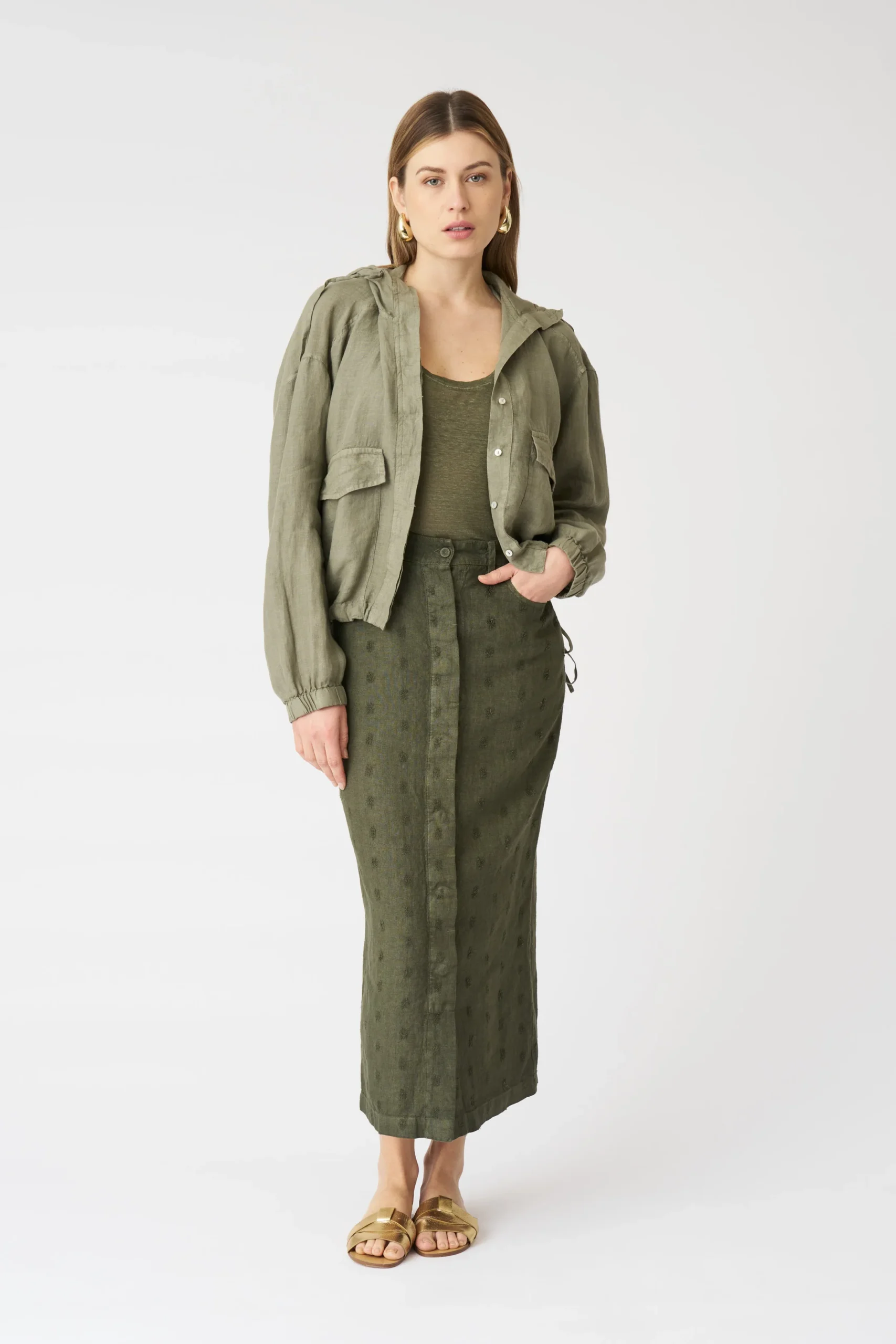 The olive green linen hooded jacket is a masterful creation that seamlessly combines laid – back charm with subtle sophistication. Its silhouette is deliberately relaxed, offering a sense of ease without appearing slouchy. The linen fabric, with its natural texture and inherent breathability, not only keeps you comfortable in mild temperatures but also adds a touch of organic elegance. The hood is a standout feature — it’s roomy enough to provide adequate coverage while maintaining a sleek shape, and the way it drapes adds a gentle, flowing element to the jacket.Small details enhance its allure: the fine stitching along the seams ensures durability and a polished finish, and the button – front closure is both functional and stylish, allowing you to adjust the fit as desired. The cropped length is a modern touch, making it ideal for pairing with high – waisted jeans, skirts, or trousers, creating a balanced and flattering silhouette.When it comes to styling, this jacket opens up a world of possibilities. For a casual daytime look, pair it with a white tee, high – waisted denim shorts, and sneakers — the linen jacket adds a touch of refinement to the relaxed ensemble. For a more put – together outfit, wear it over a silk blouse and tailored pants, finishing with ankle boots for a chic vibe. On cooler days, layer it over a knit sweater and a midi skirt, adding a scarf for extra warmth and style. No matter how you choose to wear it, this jacket’s comfortable fabric, versatile design, and charming details make it a must – have in any wardrobe, capable of elevating even the simplest outfits.