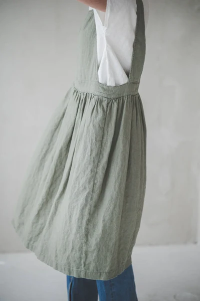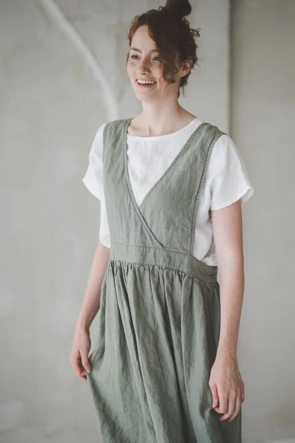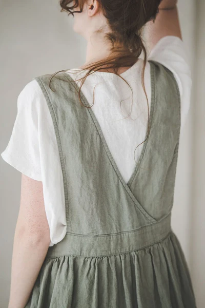 The olive – green overall dress is a masterpiece of understated design, where every detail contributes to its timeless appeal. The deep V – neckline is a standout feature, gracefully framing the upper body and creating a sense of elongation for the neck. The straps are wide and sturdy, providing both support and a touch of vintage charm.At the waist, the gathered detailing is exquisite — it cinches the waist subtly, enhancing the figure without being too tight, and then flows into a full, airy skirt. This gathering not only adds texture and movement but also ensures the dress drapes beautifully, swaying gently with each step. The side pockets are a practical and stylish addition, perfect for keeping small essentials or just resting hands casually. The midi length is both elegant and practical, hitting at a flattering point on the leg. The soft olive color is versatile, complementing various skin tones and easy to pair with different tops and footwear. Every aspect, from the smooth seams to the precise cut of the skirt, reflects careful craftsmanship, making this dress a beloved piece for those who appreciate quiet sophistication in their wardrobe.