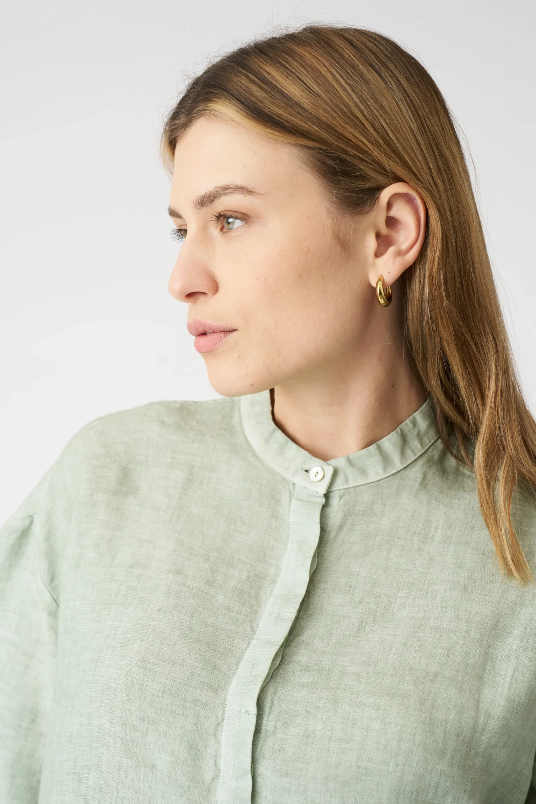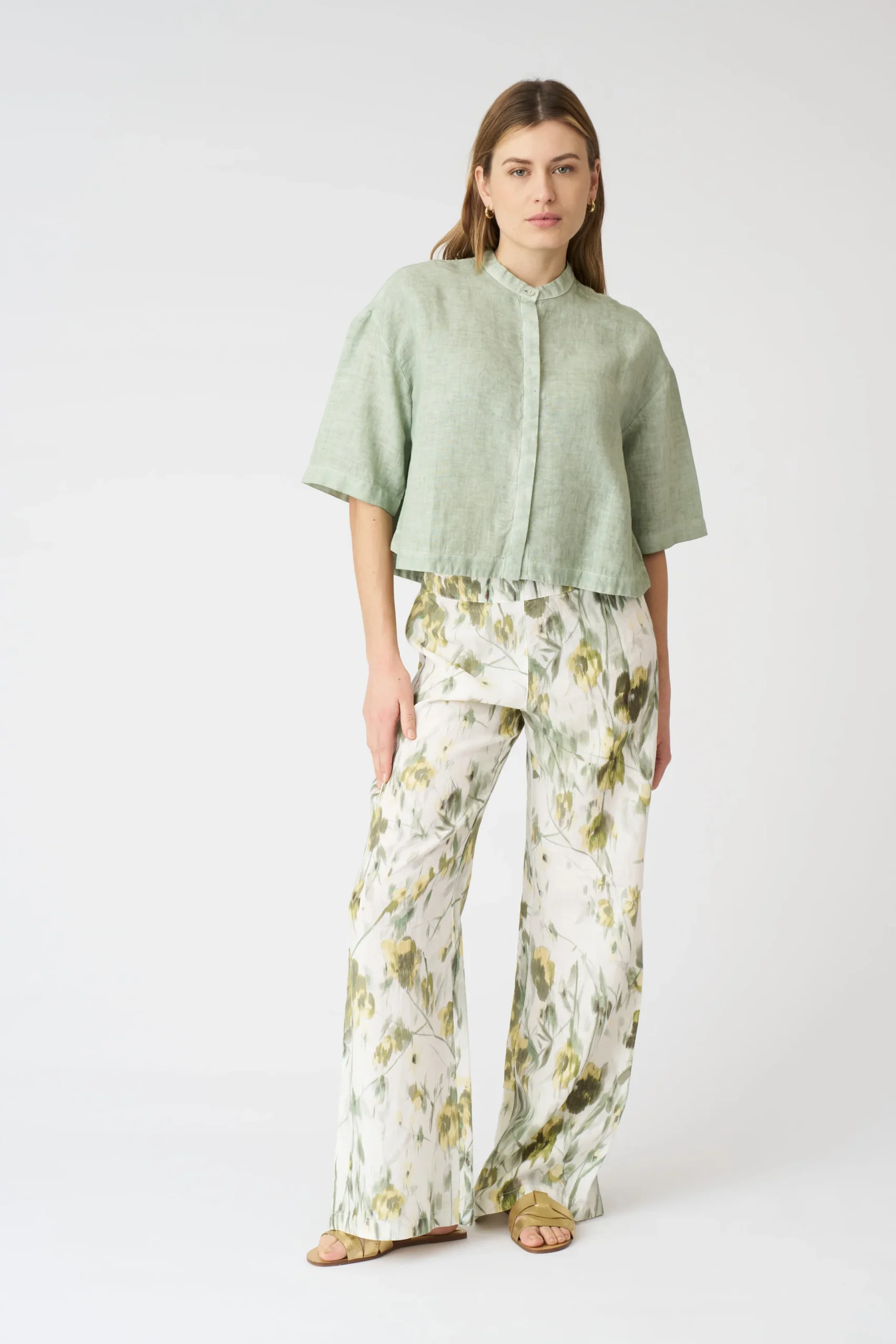 Artistic Freshness in Sage Green Mandarin – Collar Shirt Look