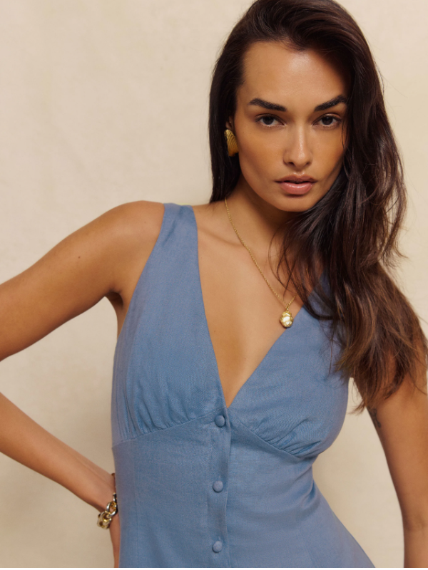 The Sebastien V – Neck Linen Midi Dress with Button Front is a masterpiece of design that balances allure and sophistication. Woven from premium linen, the fabric has a natural texture that feels soft against the skin and allows air to circulate, keeping you cool during sunny days.The deep V – neckline is the centerpiece, creating a graceful frame for the neck and collarbone. It adds a touch of sensuality without being overly revealing, striking a perfect balance between elegance and charm. This neckline also elongates the neck, enhancing the overall silhouette and lending a sense of poise.Complementing the neckline are the front buttons, which run from the bust down to the hem. Each button is meticulously placed, forming a vertical line that draws the eye and adds a structured, tailored look to the dress. These buttons aren’t just decorative; they offer functionality, allowing you to adjust the neckline or create a subtle slit for ease of movement. The midi length, paired with the flowing skirt, adds a romantic touch, making the dress ideal for occasions where you want to feel both stylish and comfortable.Whether you’re attending a garden party or a dinner date, the Sebastien V – Neck Linen Midi Dress with Button Front ensures you make a lasting impression with its thoughtful design and timeless appeal.