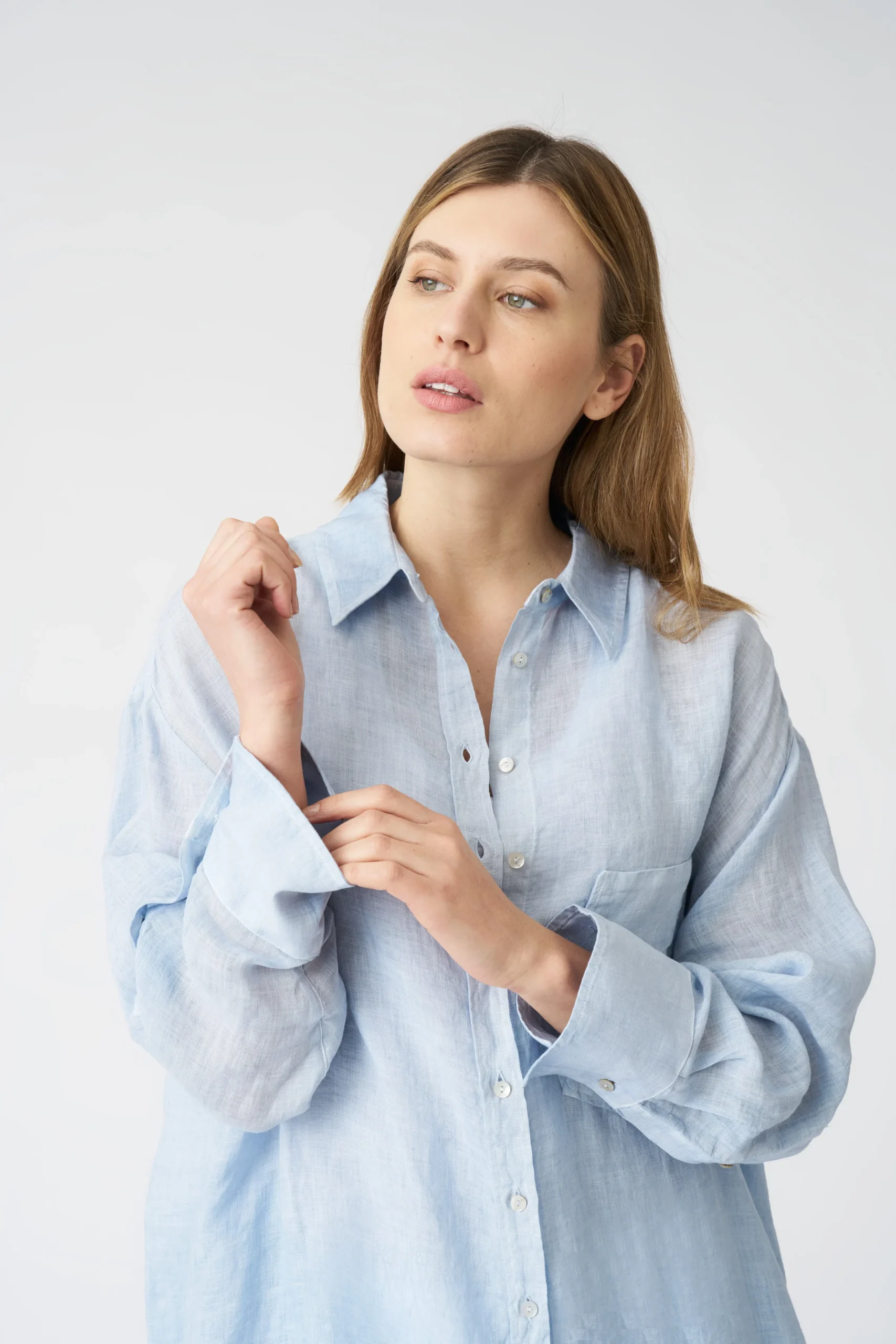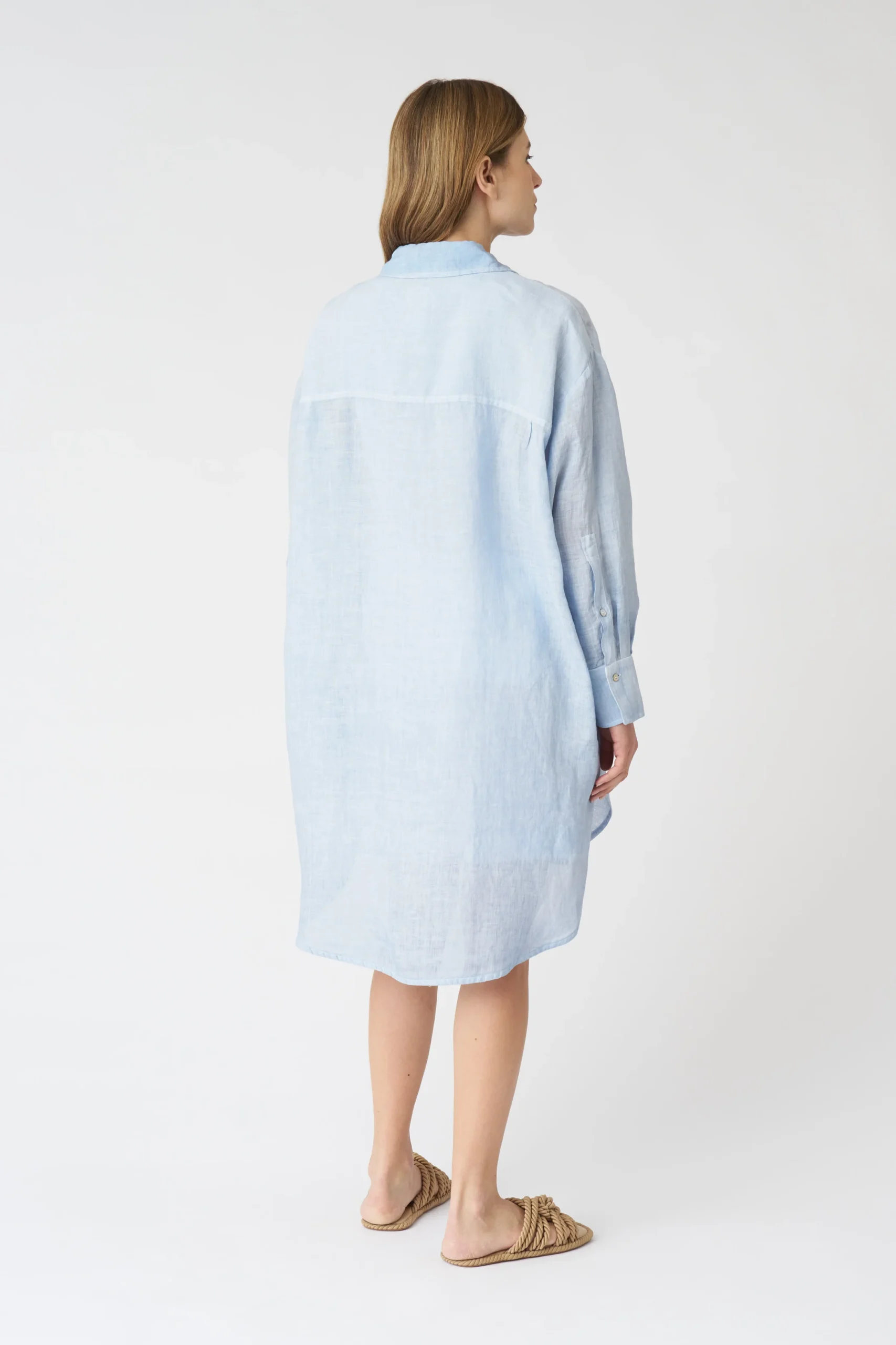The sky blue oversized shirt dress is a masterstroke in design, where every aspect, from the overall shape to the tiniest details, is crafted to elevate both comfort and style, while also offering endless styling possibilities. The oversized is the star, designed to skim the body rather than cling, creating an effortlessly chic and relaxed vibe. It’s roomy enough to wear over a tee or tank top for added layering, perfect for transitioning between seasons, or can be worn alone for a sleek, minimalist look.Small details add to its charm: the crisp pointed collar frames the face nicely, the smooth button placket runs down the front for easy wear and a polished appearance, and a single chest pocket lends a touch of utility and visual interest without overwhelming the design. The long sleeves can be rolled up for a more casual feel, and the cuffs are finished with subtle detailing that adds a hint of refinement. The hemline, with its gentle curve, softens the overall look, making it feel less structured and more fluid.When it comes to styling , this dress is incredibly versatile. Pair it with flat sandals and a straw hat for a breezy, beachy outfit perfect for summer days. For a more polished ensemble, add heeled mules and a statement belt to cinch the waist, creating a defined silhouette while still maintaining the dress’s relaxed essence. It also works well with ankle boots and a denim jacket for a cool, transitional look in spring or fall. Whether you’re going for a laid – back weekend vibe or a slightly dressed – up occasion, this dress adapts seamlessly, proving that comfort and style can indeed go hand in hand. Every element, from the fabric’s drape to the thoughtful placement of details, contributes to making it a wardrobe essential that feels both timeless and modern.