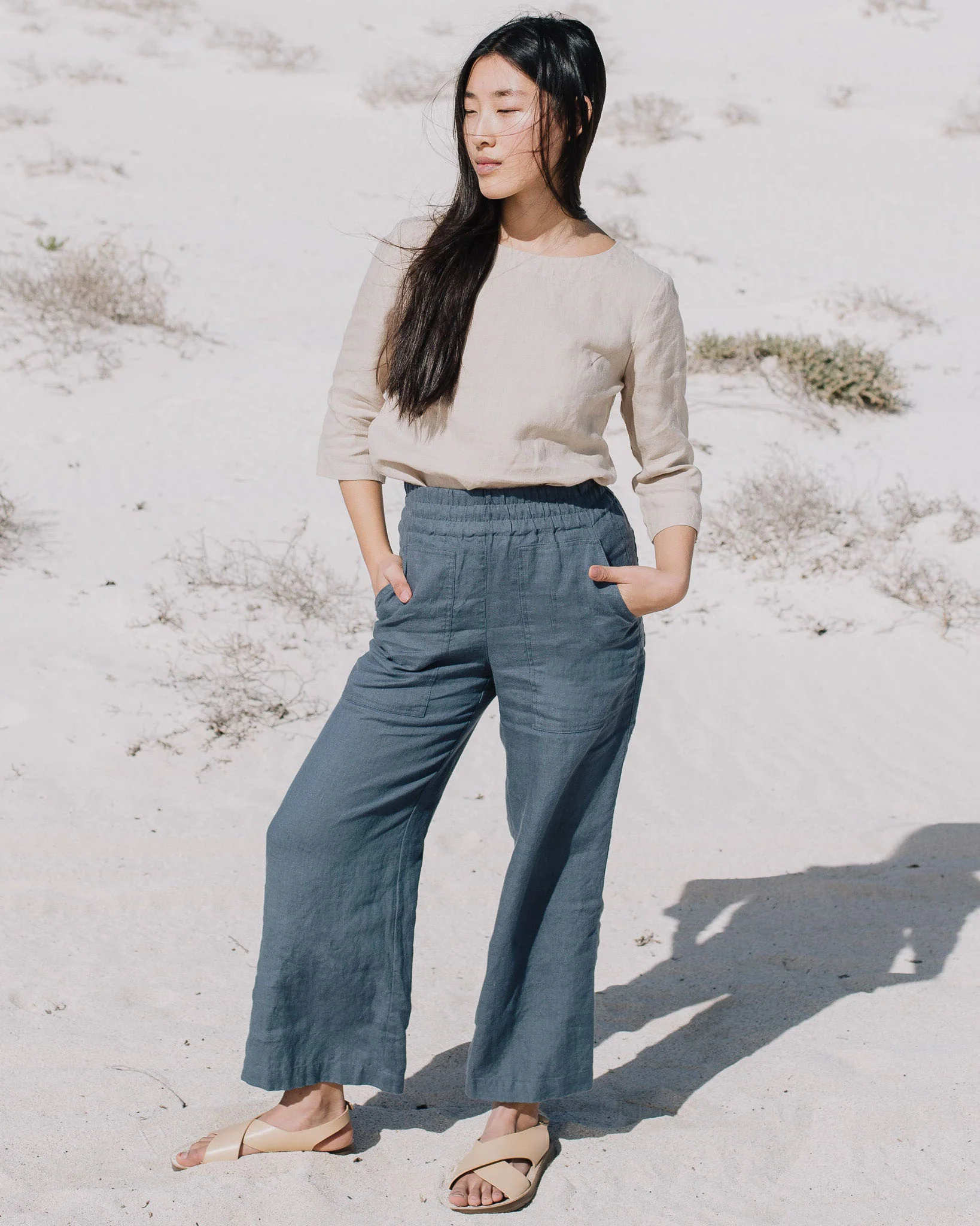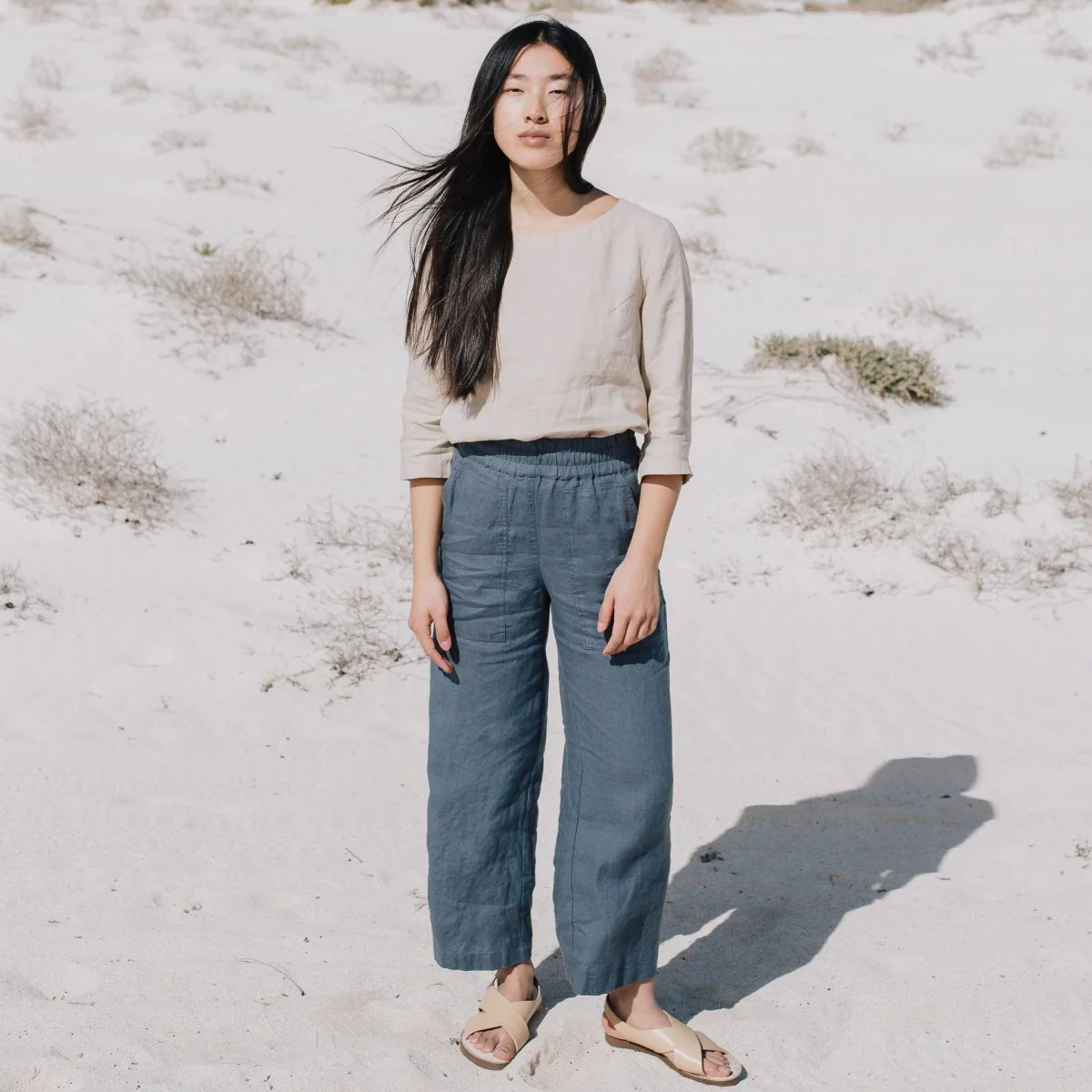 Refreshing Appeal of Slate Blue Linen Elastic – Waist Wide – Leg Trousers
