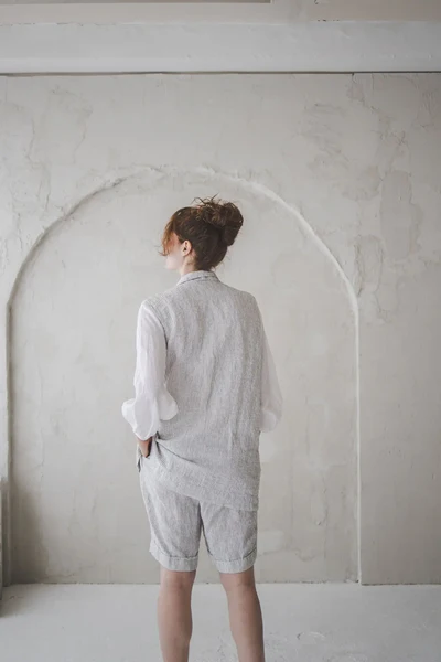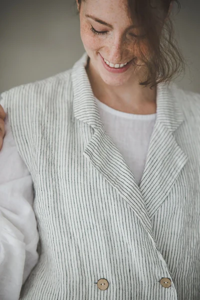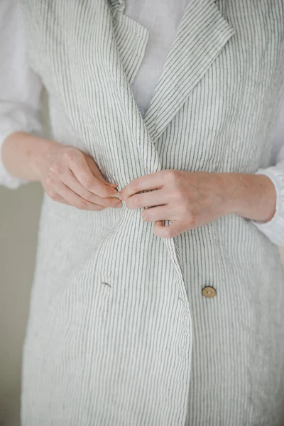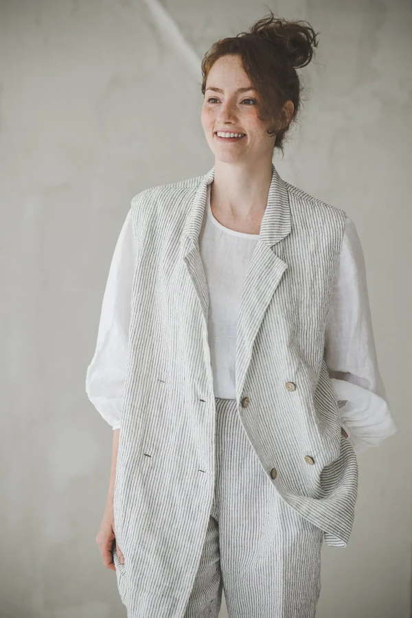 The striped linen double – breasted vest is a masterstroke in combining timeless elegance with laid – back ease. The silhouette is intentionally loose and boxy, designed to provide a sense of freedom while still looking polished. The linen fabric, with its natural texture and breathability, not only keeps you cool but also adds a touch of organic luxury to the piece. The double – breasted front, adorned with earthy wooden buttons, is a charming detail that enhances the vest’s classic yet casual appeal, and the notched lapels add a tailored touch without being too formal. The sleeveless cut allows for showcasing the layers underneath, whether it’s a crisp white shirt or a delicate blouse.Small details elevate its charm: the fine stitching along the seams ensures durability and a refined finish, and the way the linen drapes gives the vest a gentle, flowing movement. The subtle stripes in neutral tones are versatile and timeless, evoking a sense of calm and sophistication, and they pair beautifully with solids like white, black, or navy, as well as with other patterns for a more playful look.When it comes to styling, this vest offers endless possibilities. For a casual daytime look, layer it over a white linen shirt and tailored shorts, finishing with loafers — the combination of the vest and the shirt creates a balanced, preppy chic. To create a more elevated outfit for an evening event, wear it over a silk camisole and wide – leg trousers, adding heels to lend a touch of glamour. It also works wonderfully as a layering piece for cooler days — drape it over a lightweight sweater with jeans for a cozy yet refined vibe. No matter how you choose to style it, this vest’s combination of relaxed fit, breathable fabric, and versatile design makes it a standout addition to any wardrobe.