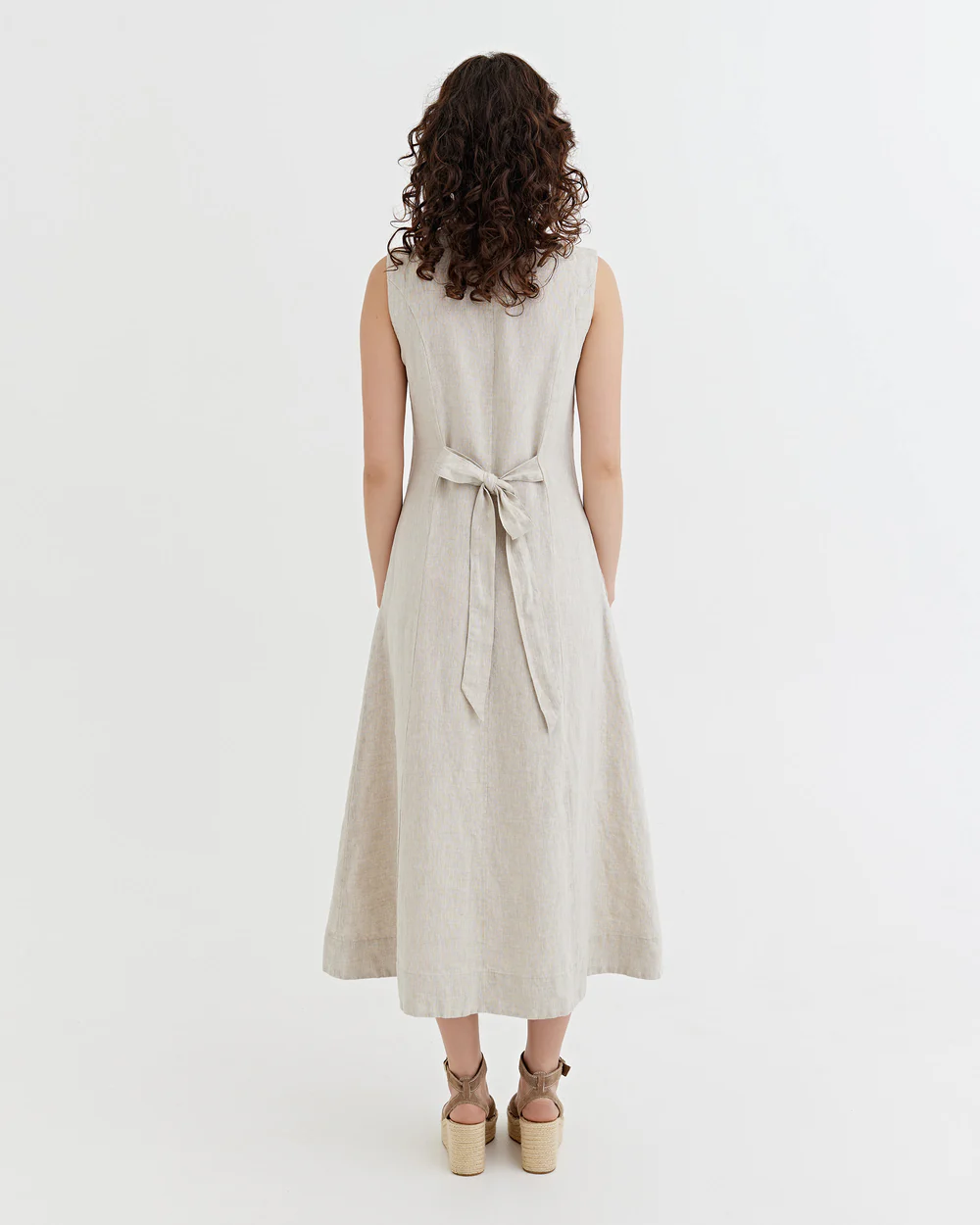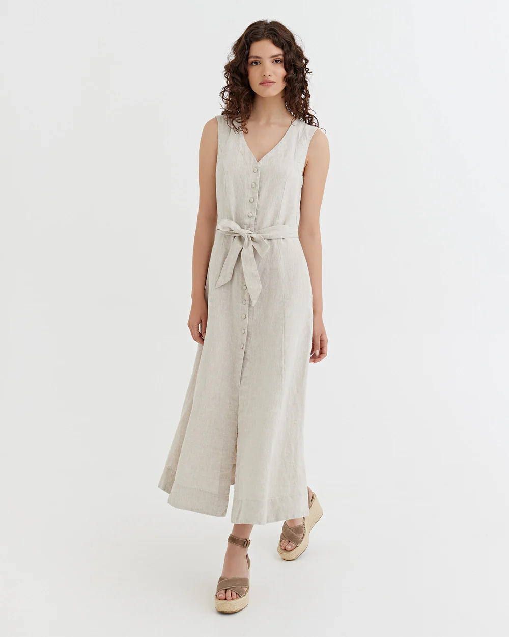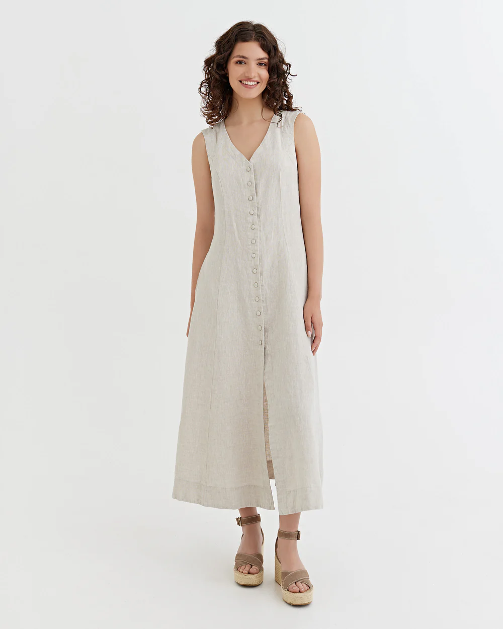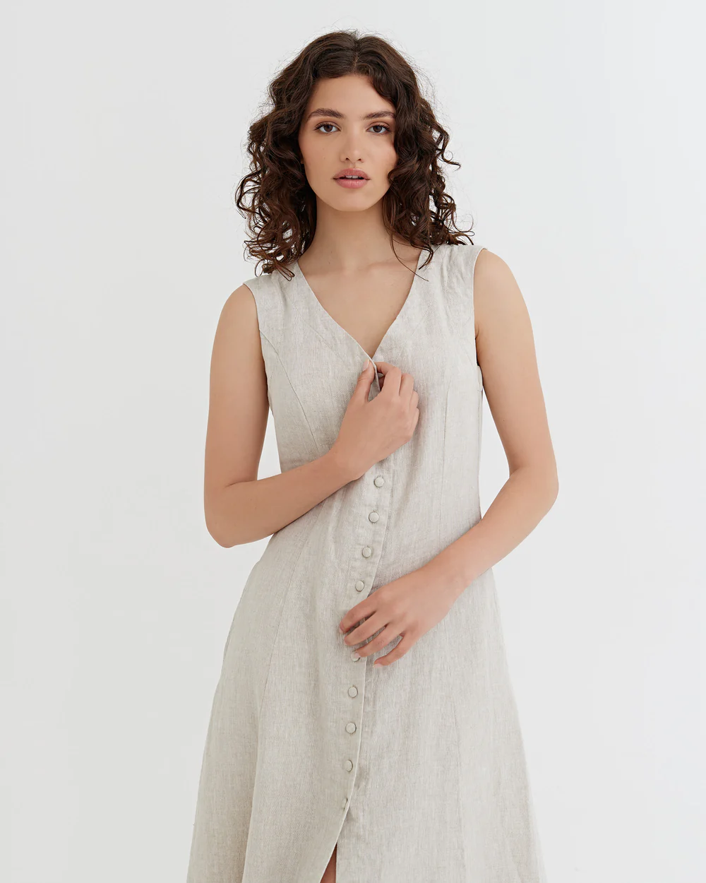 features and Special design:This off – white sleeveless maxi dress is a beautiful embodiment of understated elegance. The V – neckline and front button placket create a refined, timeless silhouette.